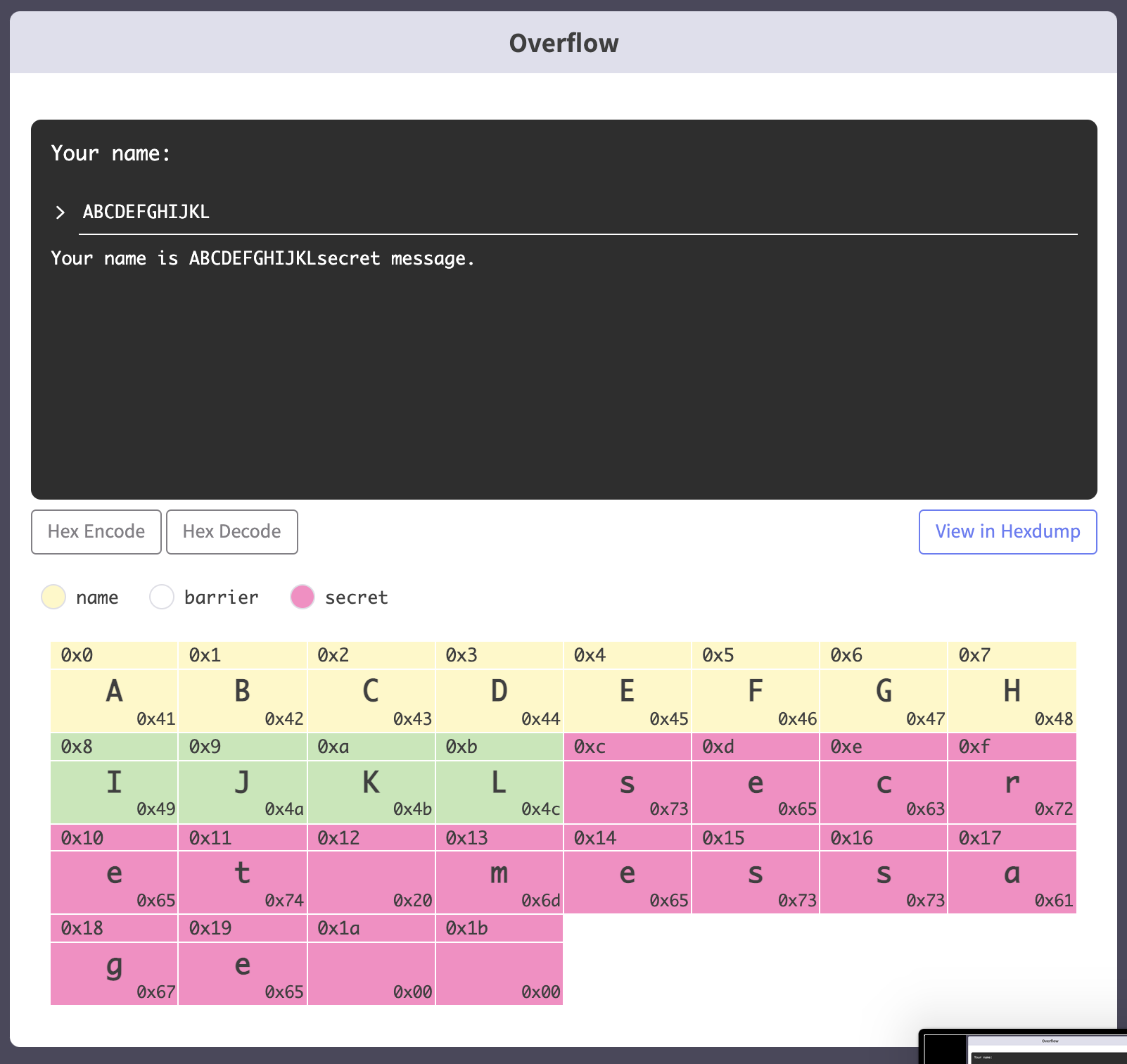 아직까지는 name 버퍼와 secret 버퍼 사이의 널바이트들이 다 채워진 게 아니라 정상적으로 입력한 내용이 그대로 출력되는 것을 확인할 수 있다.