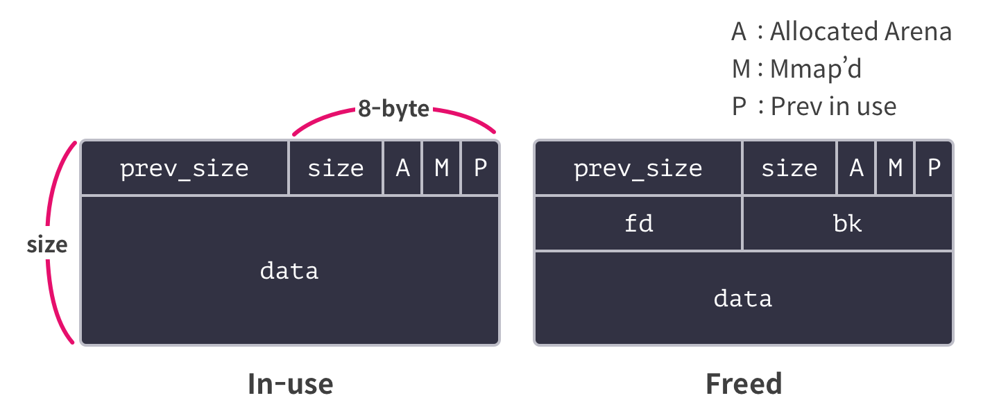 - 헤더는 청크의 상태를 나타내므로 사용 중인 청크(in-use)의 헤더와 해제된 청크(freed)의 헤더는 구조가 다소 다름