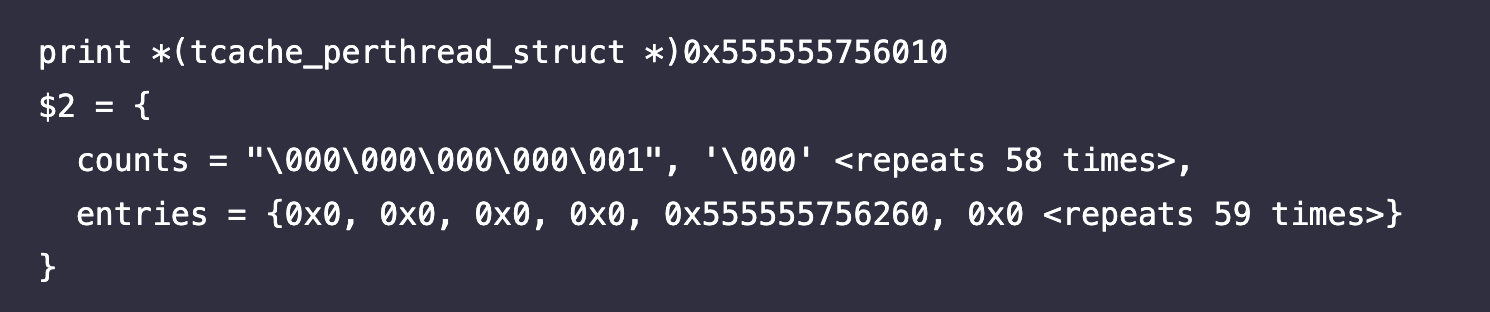 - 여기서 tcache는 tcache_perthread라는 구조체 변수를 가리킴